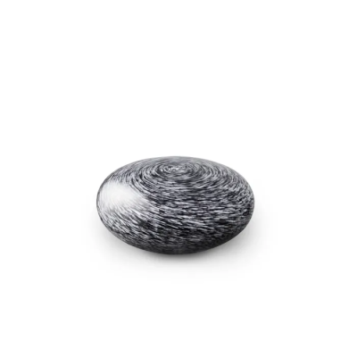 Ronde pebble, schijf ronde vorm, mix van zwart en wit, niet transparant. Het as in niet zichtbaar.
