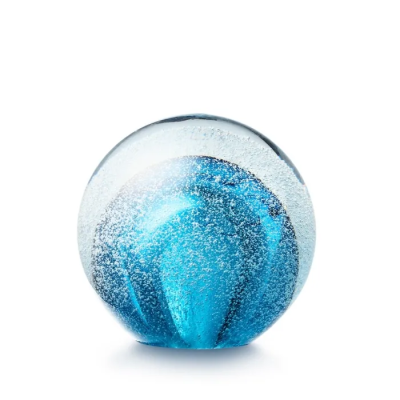 De Stardust-line is geïnspireerd op de sterrenhemel. De Stardust-line bol tiffany blauw is een ronde mini-urn die zich onderscheidt door een verfijnde afwerking en de transparantie van het glas met daarin een overvloed aan fijne luchtbelletjes. Deze prachtige mini-urn is geschikt voor het bewaren van een symbolische hoeveelheid crematie-as. Door de transparantie van het glas, is het crematie-as deels zichtbaar wat een zeer bijzondere uitstraling en betekenis geeft aan dit ornament. Aan de binnenkant bevindt zich een as-reservoir waar een klein gedeelte van het crematie-as in bewaard kan worden. Aan de onderzijde bevindt zich een vulopening die afgesloten wordt d.m.v. een zelfhechtend sluitplaatje van rvs. Elk as-gedenkornament is met de hand vervaardigd. Hierdoor is elk ornament uniek.